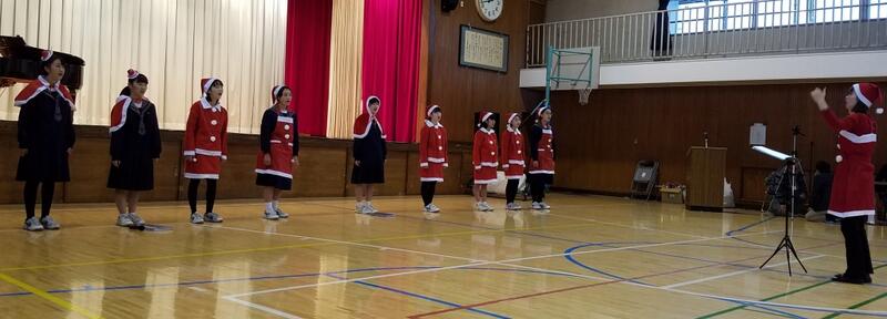 12月7日土曜日に五代小学校体育館で行われたお祭りに参加させていただき、合唱部9名サンタクロースに変身し音楽をお届けいたしました。