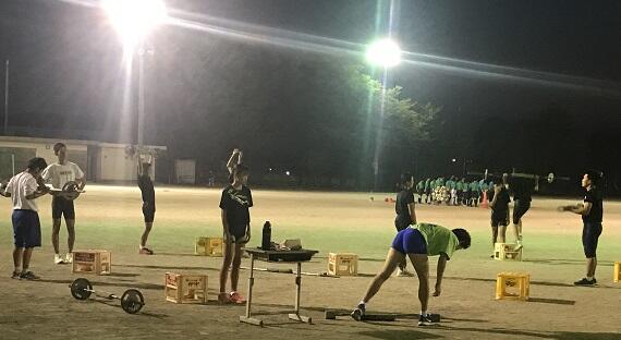 放課後の陸上部の練習をお知らせします。照明の下で頑張っています。
