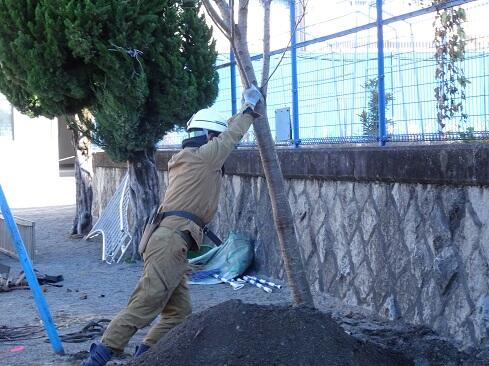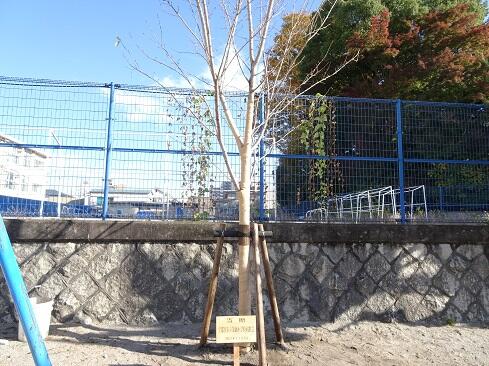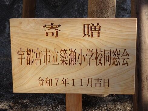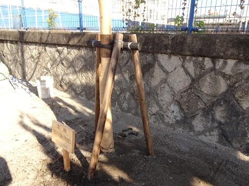 11月12日(水),簗瀬小同窓会から寄贈された桜の木がやってきました。トラックから桜の木を下ろし,所定の場所に設置します。が,30分くらいの間,担当の職人さんは木の位置を少しずつ変えては確認して,を繰り返していました。お話を伺ったところ「まずは,どの位置からもよい形に見えるように」「数十年後の枝ぶりを考えて」とのことでした。ここまで考えてくださると,簗瀬小学校のもう一つの歴史が始まった印象を受けます。今後,桜の木の下で友達と語らったり,悩みを打ち明け合ったり,木陰で一休みしたりと,それぞれにドラマが展開されるかもしれません。そして,桜の木は,これから何十年もの間,たくさんの子供たちにそっと寄り添い,見守ってくれること思います。……何だか壮大な話になってきてしまいました……寒さから守る幹巻きと安定のための棒を設置が完了し,いよいよお披露目です。簗瀬小同窓会の釜嶋会長様,PTA亀田会長様が駆けつけてくださり,子供たちとともに時間を共有しました。子供たちは「いつ花が咲くのかな?」「入学式のころに咲いてほしいな」とそれぞれに喜んでいました。さて,同窓会というのは,後輩たちの健やかな成長のために活動することを目的としています。とするならば,今回の桜の木の寄贈は正に目的そのものを達成する活動であったと思います。簗瀬小学校同窓会の皆様,地域の皆様,保護者及び御家族の皆様には,桜の木が同窓会から寄贈され,無事に植樹できましたことを御報告いたします。今後とも,簗瀬小学校の子供たちが「生き生きと学びたくましく成長してける」よう,より一層のお力添えを賜りますようお願いいたします。
