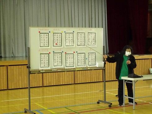 11月25日(火),6年生がふれあい文化教室を実施しました。これは,公益財団法人うつのみや文化創造財団と宇都宮市文化協会との協働で,市内の小中学校・盲学校・聾学校・特別支援学校に文化芸術講師を派遣する事業です。この事業は,子供たちが日本古来の伝統音楽・古典芸能などにふれることで文化芸術への関心や理解を深め,豊かな人間性をはぐくむことを目的に,協会会員で第一線で活躍する先生方を講師に,学校の通常の授業時間内で演奏・実演や解説,体験などを実施するものです。たくさんある体験活動の中で,今回は小倉百人一首教室に参加しました。講師は,宇都宮かるた会の方々です。百人一首は宇都宮市と深い関係があるので,誇りをもって学んでほしいと思います。