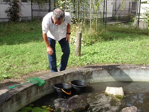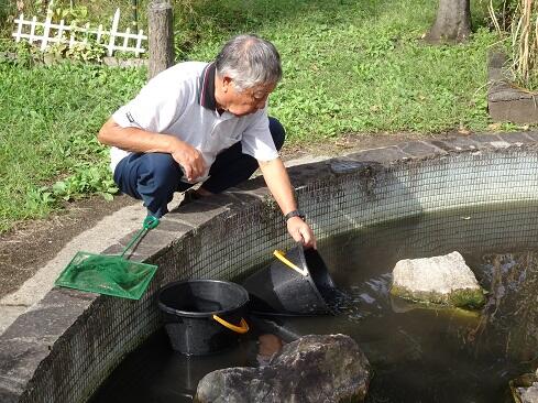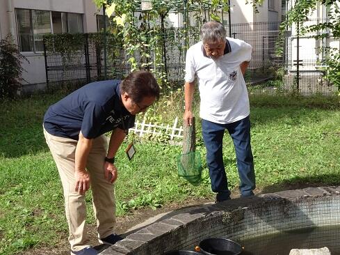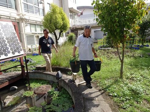 10月2日(木),毎年,中庭の池にたくさんのめだかを放流していただいている高島さんが来校しました。放流に向けてた事前の準備として,9月3日には交通指導員さんの小林さんが池の清掃をしてくださいました。用意周到,準備万端で御対応くださりありがとうございます。さて,放流直後のめだかは,所謂,めだかの学校状態で集団で泳いでいましたが,時間とともに池の状況を把握し,小さな集団に分かれていきました。放流数は,児童数よりも多いかもしれません。高島さん,小林さん,毎年ありがとうございます。