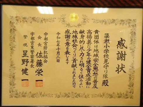 10月2日(木),簗瀬小学校見守り隊の日頃の活動に対して,宇都宮防犯協会(会長は佐藤栄一市長)から感謝状を授与されました。本校は主要駅が学区にあります。利便性がある一方で,たくさんの人が通り過ぎる地区でもあります。そのため,子供たちが事件等に巻き込まれる可能性は他の地区に比べて高いと考えます。そんな状況の中,見守り隊の皆さんは,機動力よく,風通しよく,子供たちの安全確保に常に奔走してくださっています。この日頃の取組が認められたことは,ありがたく,隊員の皆さんのやる気をさらに高めてくれることと思います。簗瀬地域の皆様,見守り隊の隊員数に上限はございません。ホームページトップから見守り隊(学校支援ボランティア)の申し込み用紙がダウンロードできますので,新規メンバーとしてお力添えをお願いいたします。年間を通じて募集しております。