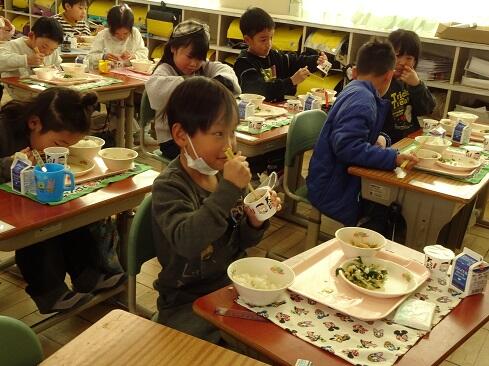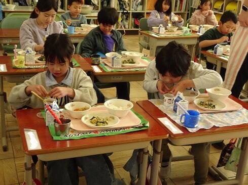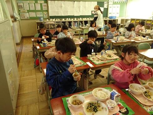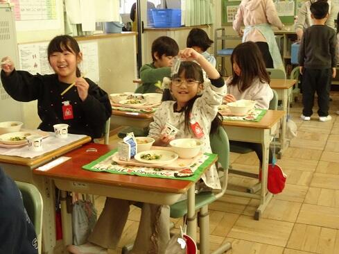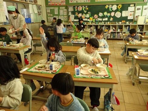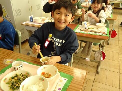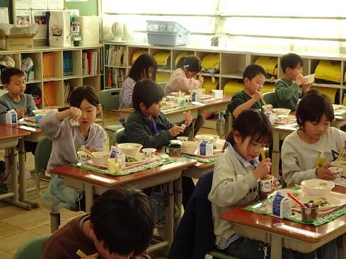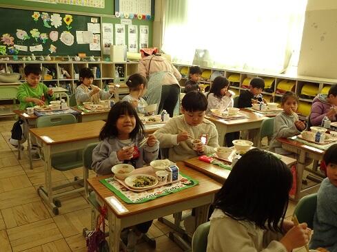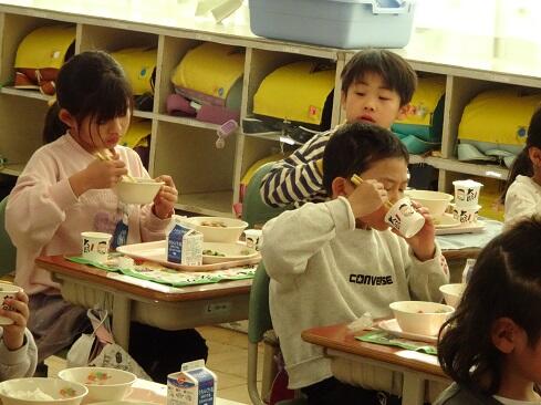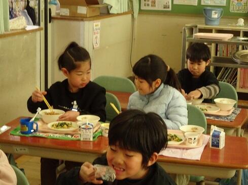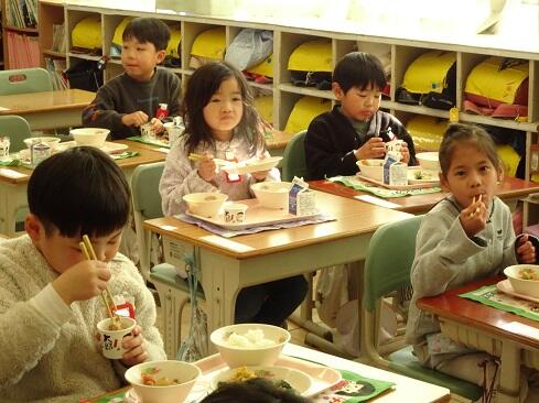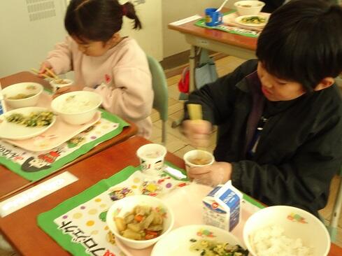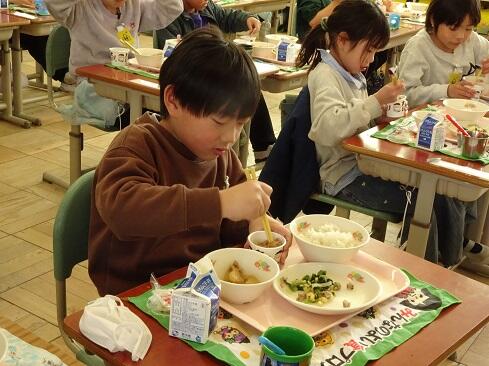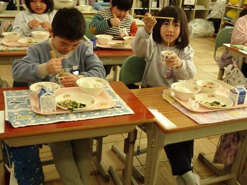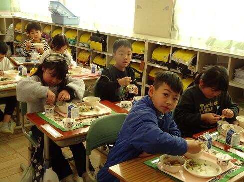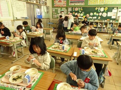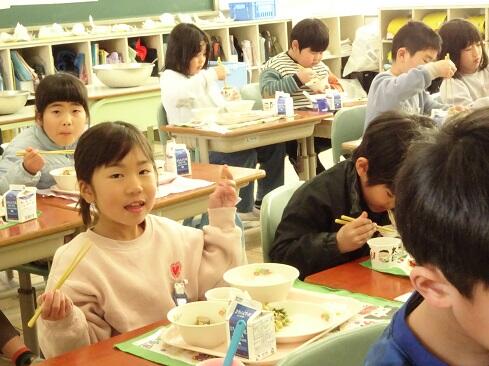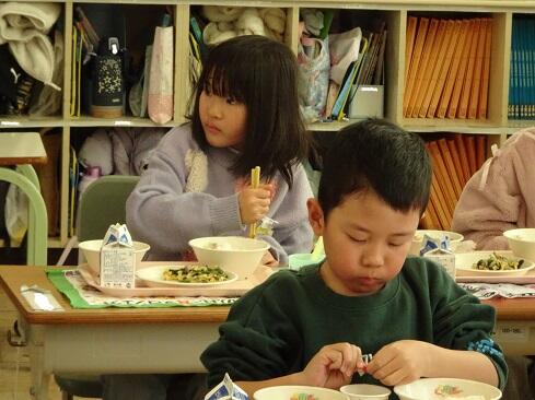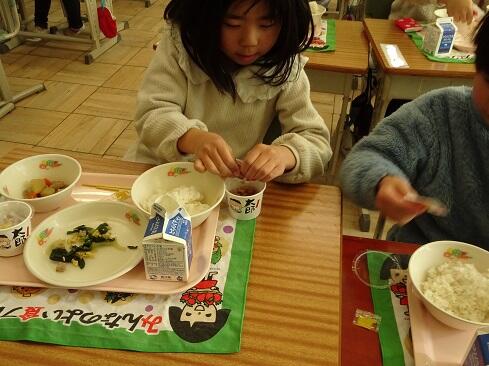 1月30日(金),給食では今年度2回目の納豆を提供しました。前回の納豆問題をクリアーした1年生を訪問してみました。「納豆2回目!」そんな声が聞こえてきました。「いただきます」の後は,パッケージを開け,たれとからしを取り出してから,納豆のビニールをとります。どの子も慣れた手つきで「ぐるぐるぐる」と回します。そんな中で聞こえてきた呟きは「ねぇ,何回まわす。」「えーとね,右に12回,左に12回。」,「お家ではからしを入れないけれど,ためしてみようかな。」「すごいね。」でした。納豆名人がいたり,チャレンジャーがいたり,1年生はたくましく成長しています。采配を振るって,楽しい,おいしい給食でした。……12回⁉勉強になります。