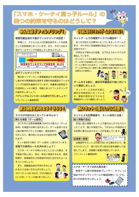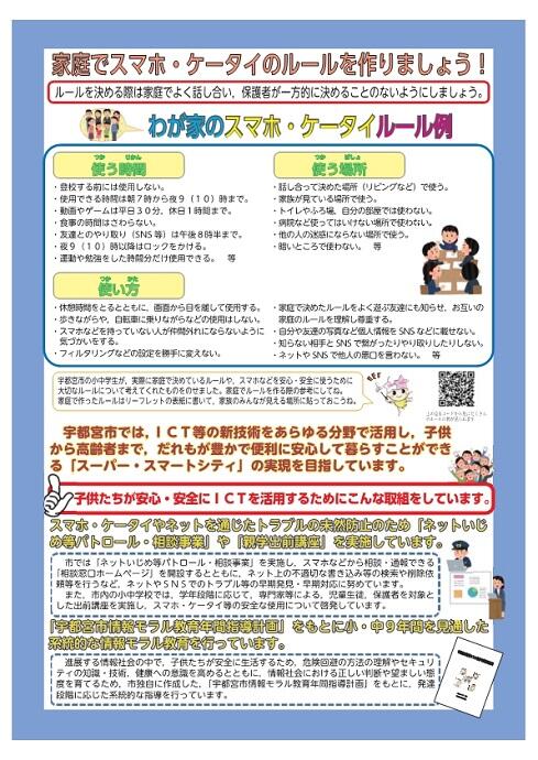 宇都宮市では,1月13日(火)~2月27日(金)を,携帯電話等を所持している児童・生徒にフィルタリングの設定を促すための「スマホ・ケータイフィルタリング100%キャンペーン期間」とし,全小中学校で一斉に実施しております。本校は,2月6日(金)を重点指導日として,フィルタリングやペアレンタルコントロールの重要性などについて,指導を行いました。本通知に添付したリーフレットには,フィルタリングやペアレンタルコントロールの設定について掲載しています。子供たちをスマートフォン等に関する犯罪被害やSNS等のトラブルから守るため,リーフレットを参考にしながら,普段の使い方を見直す機会としてくださるようお願いいたします。