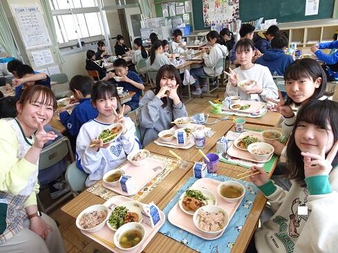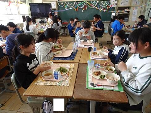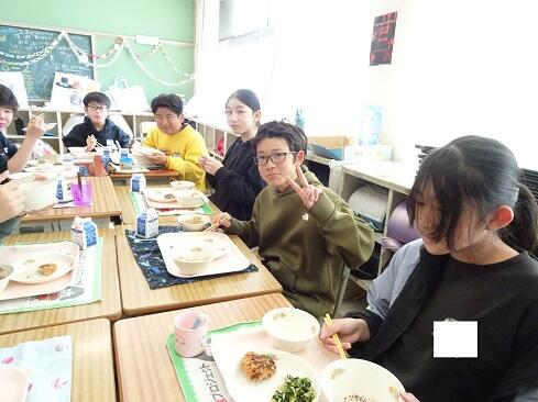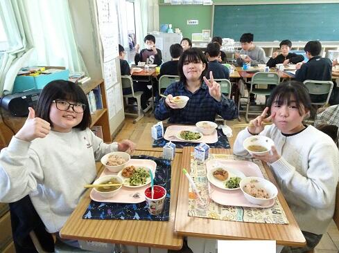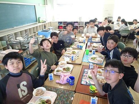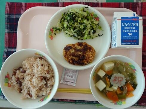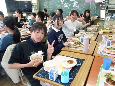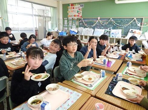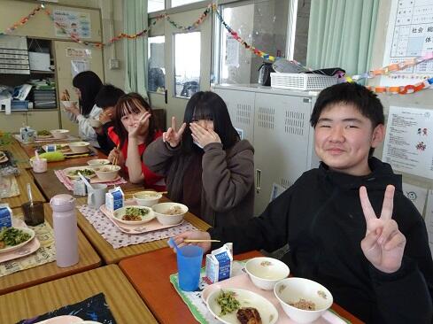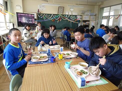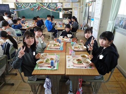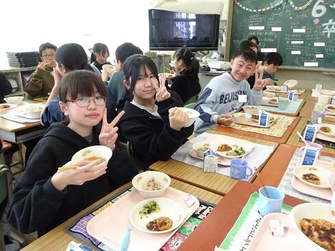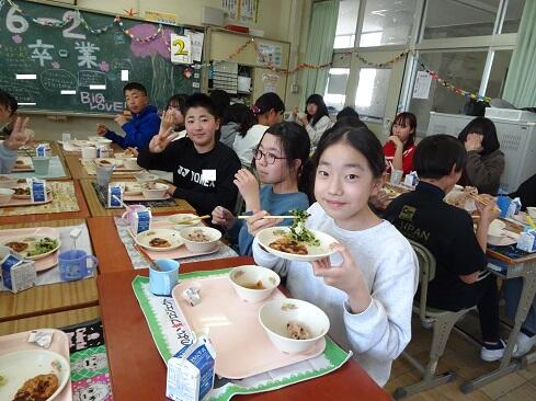 3月17日(火),19日の卒業を前に,お祝いの給食を提供しました。お赤飯はもち米の色付けにもこだわり,いつも通り「ささげ」を使います。お浸しは,市内人気メニュー第1位の「磯部和え」です。さて,今回は,主役の6年生のショットをアップします。給食調理員さんたちからお祝いのメッセージが届いていますので,御紹介いたします。「ご卒業おめでとうございます。あさっては卒業式ですね。みなさんが「ごちそう様でした。」「おいしかったです。」という言葉が私たちの一番のエネルギーになりました。これからも,苦手なものも少しずつ食べられるように挑戦してみてください。6年生の皆さんが,大きく羽ばたくことを願っています。/給食室一同」~たくさんの人に祝ってもらえることは本当にありがたく,うれしいものです~