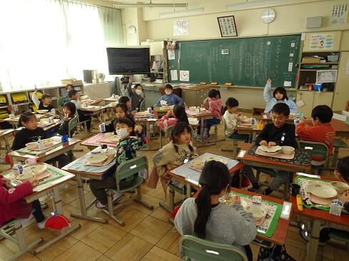 12月22日(月),冬至の日給食を提供しました。さて,冬至は北から南に向かうことを意味しています。かぼちゃは漢字で書くと「南瓜」。そこで,冬至にふさわしい食べ物とされていました。かぼちゃには,カロチン・ビタミンAなどが豊富に含まれていて風邪予防などにも効果があります。かぼちゃは夏野菜ですが,長期保存できるため,冬に栄養をとるためにと昔の人々が考えた知恵とも言えます。さて,冬至の食事は、運気上昇と健康を願い「ん」のつく食べ物や,邪気を払う小豆,胃腸を整えるこんにゃくが定番です。今回は,なんきん,にんじん,うどん,てんどん,だいこんが当てはまります。この中のうどんには,餃子の皮を活用しました。物価高騰の中,学校栄養士と給食調理員が知恵を絞りました。その結果,クオリティを保ち,ゆで時間短縮,そして価格を抑えることができました。アイディアに感謝です。また,子供たちから「天丼,つゆだくでお願いします」という声も聞こえました。さすがです,やなぜの子。