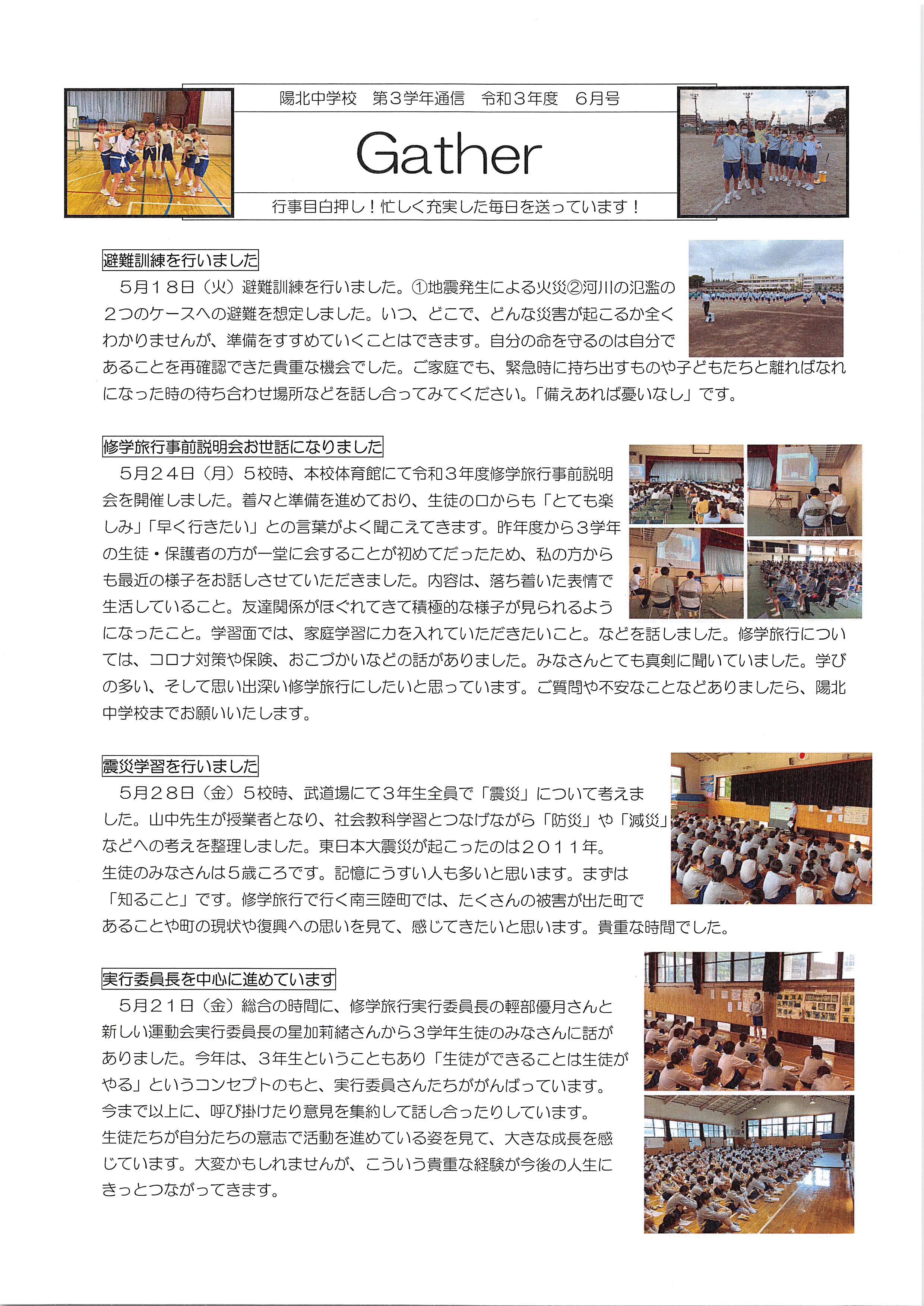 6/8 第3学年通信「Gather」6月号 投稿日時 : 2021/06/08 システム管理者 3学年だよりを発行しました。下記ファイルよりご覧ください。 第3学年通信「Gather」6月号.jpg {{options.likeCount}} {{options.likeCount}}