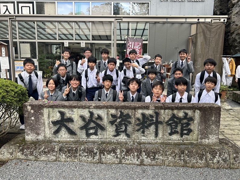 【午後:大谷石資料館】 地下採掘場跡を訪問し、1年生の地層分野で学ぶ凝灰岩(大谷石)を現地で観察しました。軽石が固まってできた岩石の特性や、歴史的な利用方法について「見て触れて」学ぶ、貴重な体験となりました。