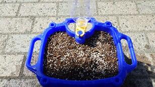 つちのうえに,もとひをまいて,みずをたっぷりかけました。