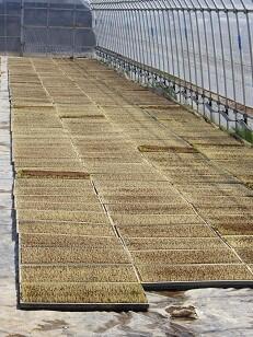 1cmほど芽が出たら育苗箱から出し,ハウスに並べます。