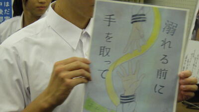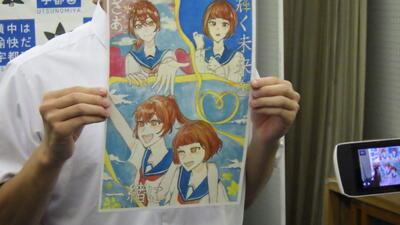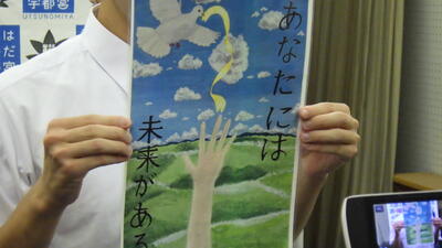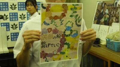 【「横川中いじめゼロポスターコンクール」の表彰】金賞:藤井さん、銀賞:三島さん、同賞:大草さん・針生さん