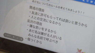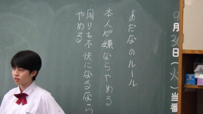 あだ名をつけるなどの何気ない行動が、人の気持ちを傷つける可能性があることが分かりました。相手の気持ちを考えることで、いやな思いをすることを減らしていくことができると思います。各クラスで決めたルールを守り、誰一人傷つくことのない、明るく風通しの良い横川中学校を目指しましょう。