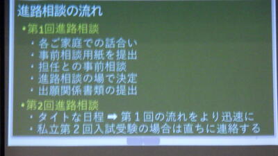 3年生たちの受験に向けての準備はすでに始まっていますが、いよいよ本格的に受験校を決定する時期となりました。生徒たちは保護者の皆さんと一緒に、真剣に説明を聞いていました。