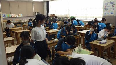 4月9日から開館中の図書室。今日もたくさんの来室者がありました。図書当番も大変そうですが、今日は校長先生も来室して3年生とブックトークをしていました。