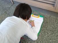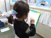 1年生はじっくりと友達の作品を見て、どんなところがよかったのか、どんなところをまねしたいかなどについて、一生懸命にワークシートに書き込んでいました。