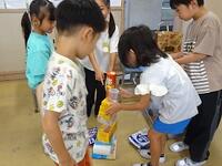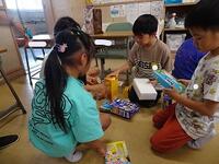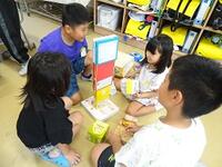 家から空き箱を持ってきて、そのかたちをくらべながら、高く積み上げようとグループの友達と協力していました。