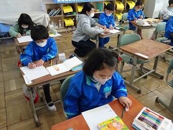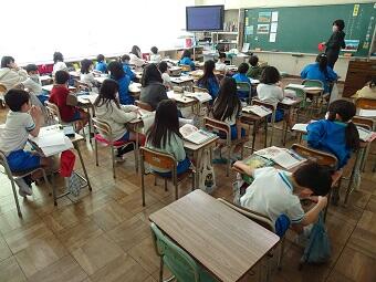 4年1組は書写「お礼の気持ちを手紙で伝えよう」で,封書の書き方を練習していました。