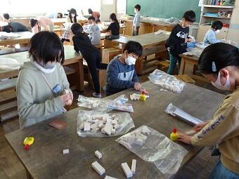 3年2組は図工「のこぎりひいて ザクザクザク」で,木材をしっかり押さえながら,のこぎりで切る作業をしていました。のこぎりの使い方にどんどん慣れてきているようでした。