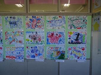 2年生の図工の作品です。型紙とローラーを使って色を着けました。見ていると,ストーリーが想像できて楽しくなる作品です。