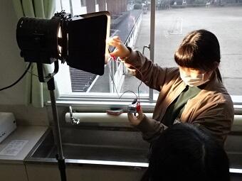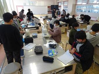 6年1組は理科「発電と電気の利用」で,手回し発電機で電気を作り,豆電球を点灯させていました。回す速さを変えて光り方の様子を確かめていました。