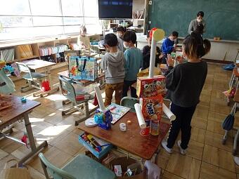 1年2組は図工「はこと はこを くみあわせて」で,飾りを付けて,作品を仕上げていました。