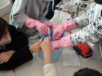 6年1組は家庭科で,雑巾を縫っていました。一針一針,丁寧に心を込めて縫っています。