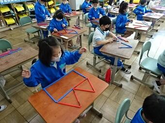 1年1組は算数で,教材のストローを使って三角や四角を作って,いろいろな形にしていました。