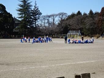 まだ空気が冷たいなか,5年1組は体育でサッカーのゲームをしていました。広いコートで伸び伸びと運動しています。