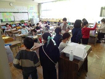 2年生は,今年も地域のお年寄りとの交流会ができないので,図工で作った作品を来年のカレンダーにしてプレゼントを用意しました。コミセンの代表の方に感謝の気持ちをお伝えして,プレゼントを皆さんに渡していただけるようにお願いしました。地域の皆様,いつもありがとうございます。