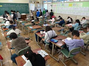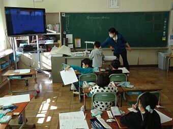 外国語教室では1校時から3校時に,5年生の外国語の授業を校内で公開していました。「これまでに学んだ表現を使って,先生方に質問をしよう。」という内容で,「誕生日に何が欲しいか」「何の教科が好きか」「何時に〇〇するのか」「〇〇できるか」「どの国に行きたいか,それはなぜか」などの質問を参観者に質問し,答えてもらっていました。