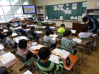 1年2組は算数で,プリントを使って「水のかさしらべ」「ひろさくらべ」の練習問題を解いていました。