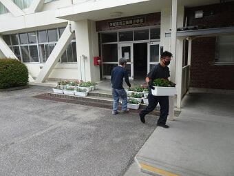 国体・障スポのために,栽培委員が植えた日々草のプランターを,会場に設置するために担当の方が運んで行かれました。どの会場に飾られるかは分かりませんが,国体・障スポに,文字どおり花を添えることになります。一部の競技は始まっていますが,国体・障スポの成功を祈念します。
