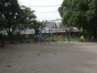 その隣では,2年1組も体育で,フラフープやミニハードル,段ボール箱を障害にして,いろいろな走り方をしていました。授業の後半は,1組と2組が場所を交代して,運動していました。