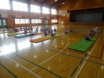 1年2組は体育で,マットの上でいろいろな転がり方,回り方を練習していました。