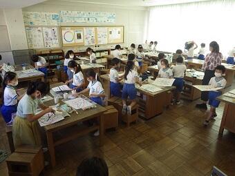 6年2組は家庭科で,ナップザック作りの実習に入るところでした。自由に選んだ柄の作品が出来上がるのが,とても楽しみです。