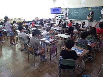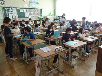 5年2組は外国語で,「シンガポールではマーライオンを見ることができます。」など,どこでどのようなことができるかを,英語で伝え合っていました。