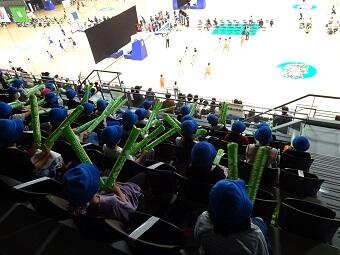 5年1組は体育「ソフトバレーボール」で,チームを作りミニゲームをしていました。