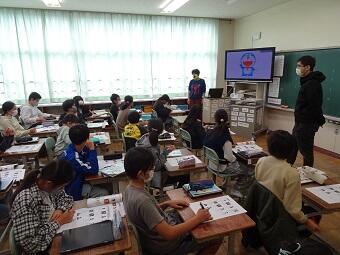 1年1組は,ICT支援員が支援に入り,クロームブックを使って,イラストや図形の位置や大きさを変えるなどの操作を練習していました。