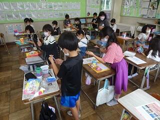 2年2組は図工「見つけたよ わたしの色水」で,絵の具を水で溶き,たまごパックで色水を混ぜ,すてきな色水を集めていました。