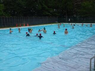 1年1組は体育で,プールの中でジャンケンなどのいろいろな動きをしていました。