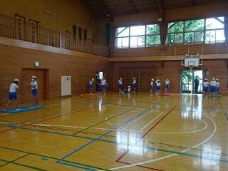 6年1組は,体育館で走り高跳びの練習をしていました。