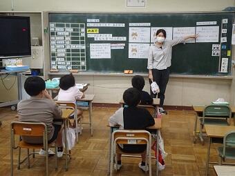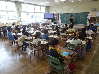 1年1組は国語で,「もこもこ」だったら「ひつじ」のように,音に合っているものを考えていました。