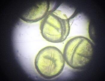 5年3組は理科で,顕微鏡を使ってヘチマの花粉を観察していました。