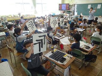 3年2組は書写の時間,毛筆で「折れ」の練習をしていました。
