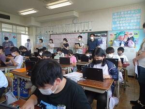 6年1組は総合的な学習の時間「探そう 自分」で,クロームブックのスクールタクトを使い,友達とコメントを送り合いながら活動しました。自分探しに向けて,これから追究していく課題を設定していました。また,この授業は同僚に授業を公開する「一人一授業」の授業でした。授業力向上のための研修として位置付けています。