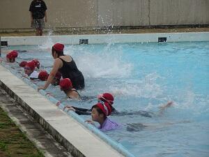 4年2組は体育で,泳ぎにつながるバタ足などを練習してから,泳ぎ始めていました。