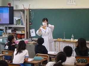 学校薬剤師の後藤先生にお越しいただき,5年生が薬育教室の授業を受けました。薬の正しい服用の仕方を説明いただいたり,薬はなぜ水で飲むのがよいのかが分かる実験を見せていただいたりしました。後藤先生には,教室や給食室,プールなど,衛生面の様々な項目を定期的に検査していただき,ご指導いただいています。後藤先生,いつもありがとうございます。