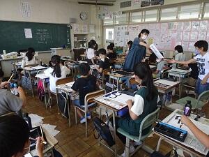 5年2組は家庭科の授業を「一人一授業」で公開していました。道具箱の整理整頓の工夫について考え,クロームブックの画面を見せ合いながら,友達と交流していました。学習したことを,実践につなげてほしいと思います。
