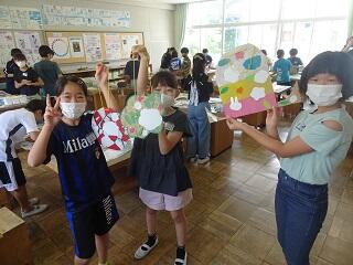5年2組は図工でメッセージボードを作っていました。ひもを通して完成です!