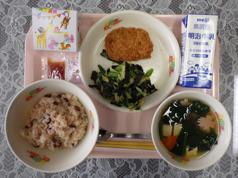 赤飯 ごま塩 ヒレカツ ソース 磯辺あえ すまし汁 お祝いケーキ 牛乳